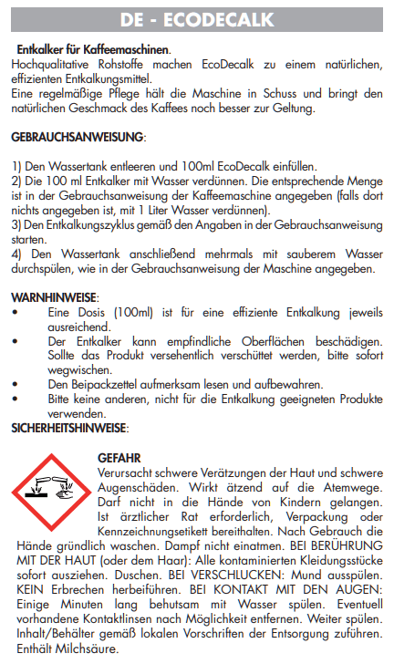 Delonghi EcoDecalk ist ein ökologischer Entkalker, der effektiv Kalkablagerungen entfernt und für eine längere Lebensdauer Ihrer Kaffeemaschine sorgt. Er enthält hochwertige pflanzliche Abrundungsmittel, die biologisch abbaubar und umweltfreundlich sind. Der Karton und der Kunststoff der Verpackung sind zu 100% recycelbar und die Flasche besteht zu 50% aus recyceltem Kunststoff.